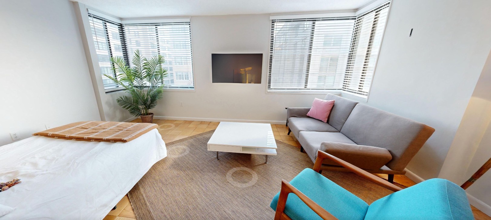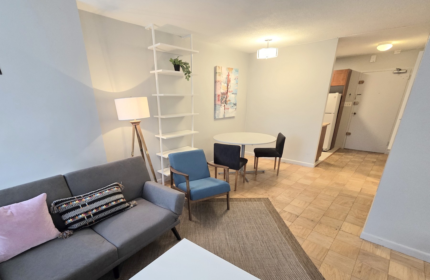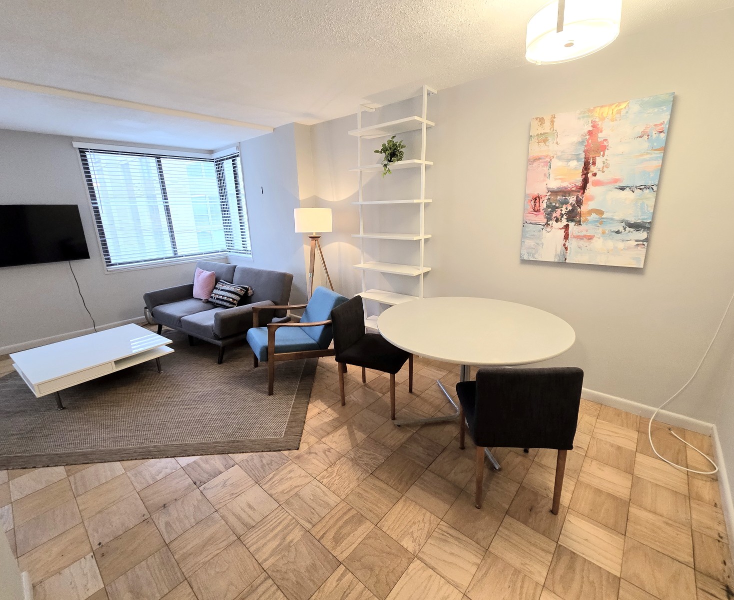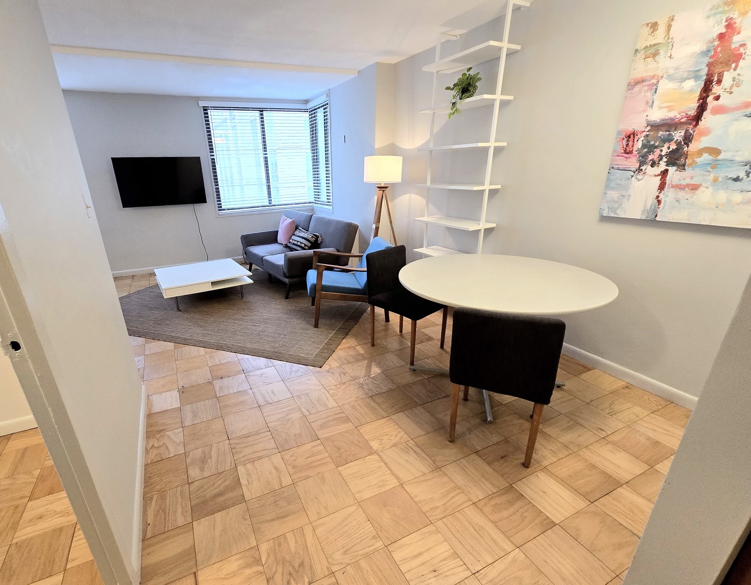 Bright, front facing studio apartment on the second floor. A cheery unit with a wall of windows and new dark wood tile floors. Lots of closets with a walk-in dressing room and nice kitchen with a gas stove. Across the street from the GWU campus. Rented for $1,850.